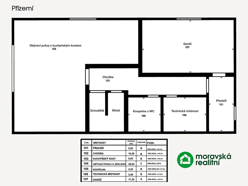 Dispozice přízemí (85,09m2): Předsíň, chodba, obývací pokoj s kuchyňským koutem a velkoformátovým oknem (HS portálém) s přímým vstupem do zahrady, sklad pod schody, koupelna s WC, technická místnost, garáž