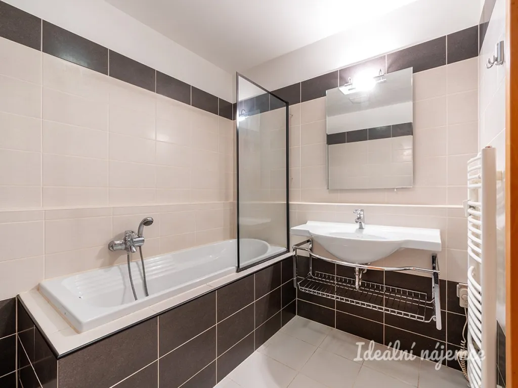 Vkusně řešená prostorná koupelna s vanou se sprchovou zástěnou, toaleta je samostatná.