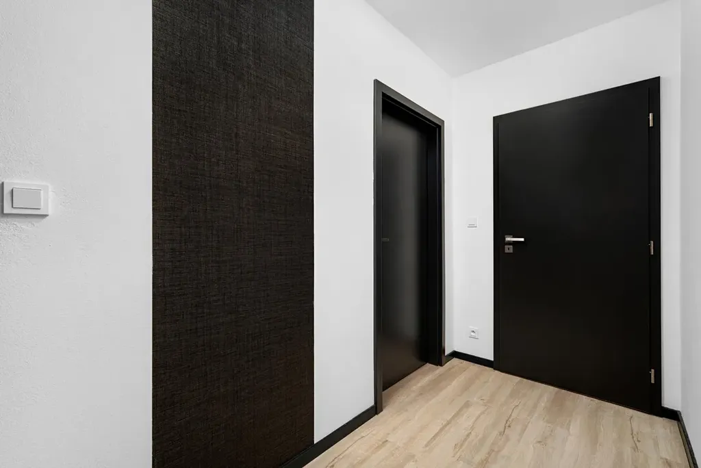 Kuchyně s jídelním koutem (21,8 m2) je orientována na severovýchod. Nová kuchyňská linka s vestavěnými spotřebiči a skříňky až ke stropu nabízí dostatek úložného prostoru. Obývací pokoj (20,1 m2) je průchozí do ložnice (15,9 m2), oba pokoje jsou rovněž orientovány na severovýchod.