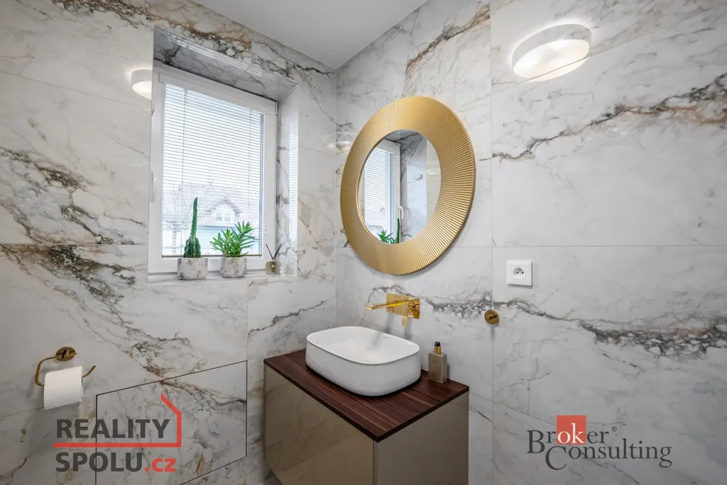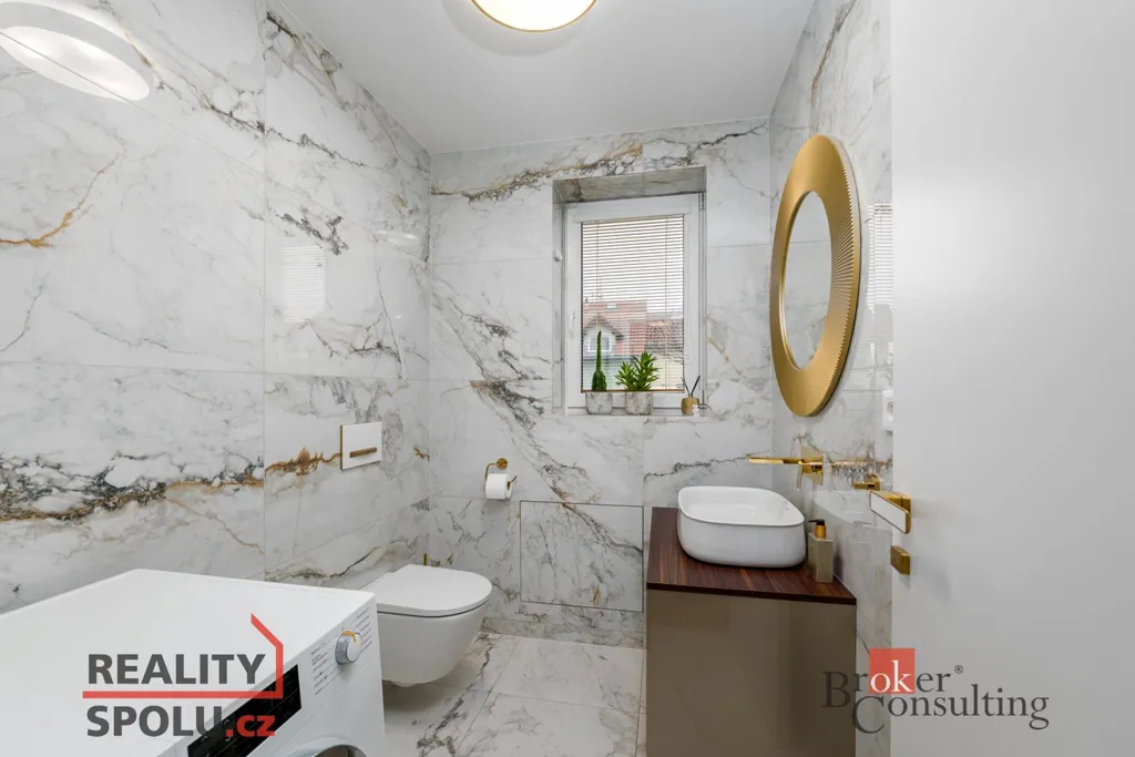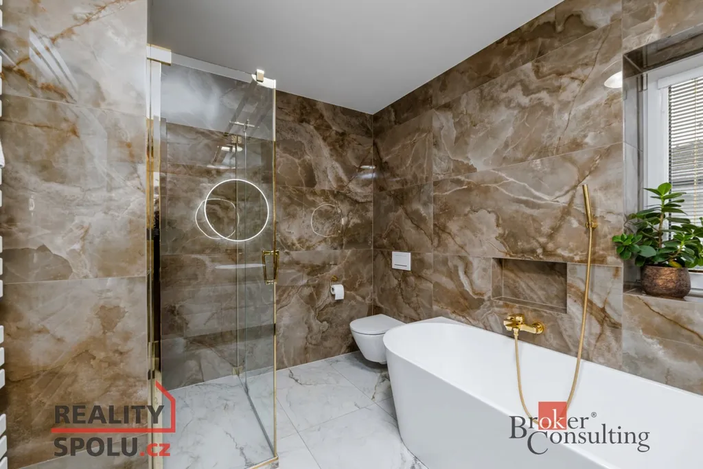 • luxusní koupelna s prostornou vanou i sprchovým koutem, obklady od italských výrobců, baterie Sapho ve zlatém designu (součástí koupelny je i toaleta)