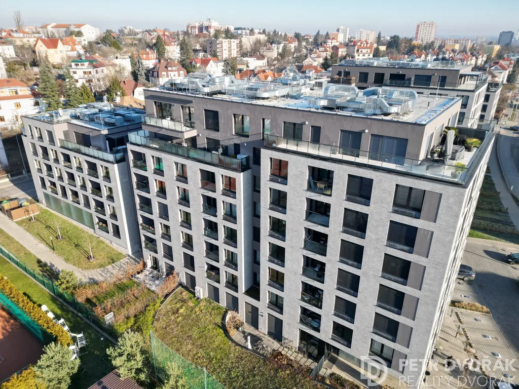 Rezidence funguje jako uzavřený areál s privátním vnitroblokem, nepřetržitou ostrahou a komunitním zázemím včetně kavárny a vinárny v parteru. K bytu náleží zděný sklep s alarmem o výměře 4 m². Možnost dokoupení venkovního parkovacího stání.