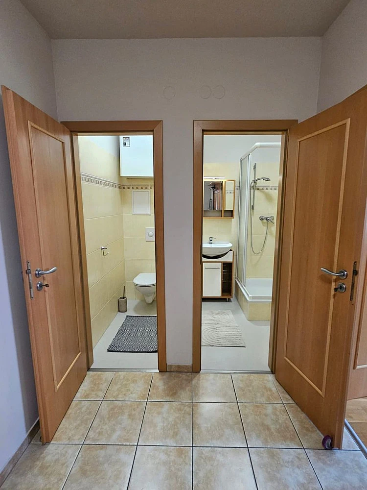 ✅ podlahy: dřevěné + dlažba v chodbě a koupelně