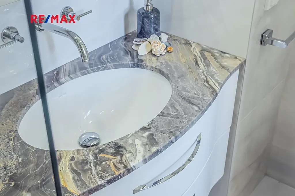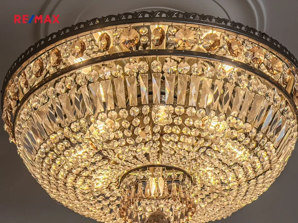 Interiér bytu osloví svými luxusními prvky, mezi které patří nádherné křišťálové lustry na míru a elegantní mramorové desky, jež dotvářejí jedinečnou atmosféru prostoru. Všechny použité materiály jsou nadstandardní, včetně keramických vypínačů, které dodávají bytu stylový a sofistikovaný vzhled.