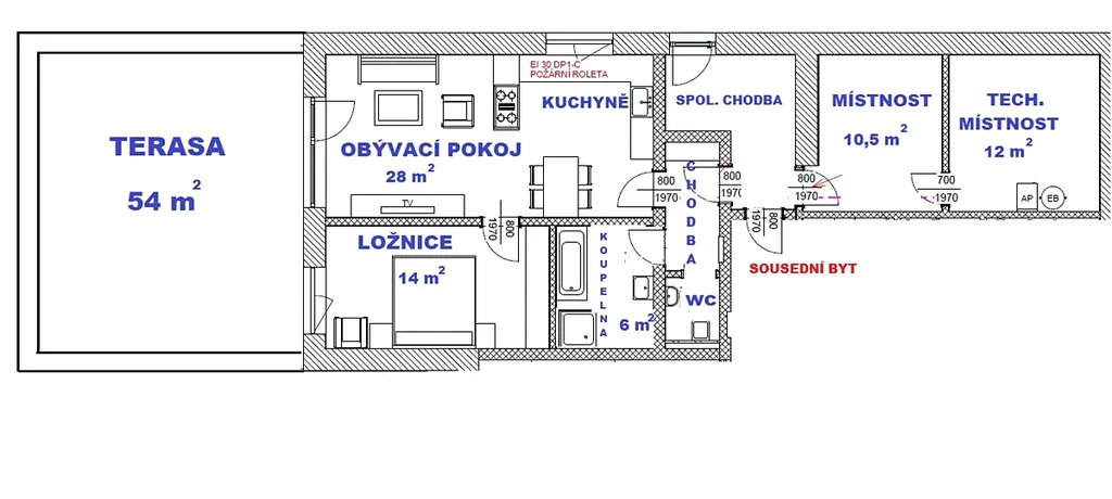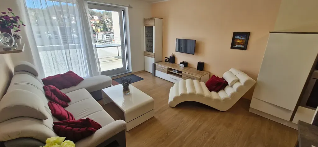 Byt o užitné ploše 54 m² nabízí prostorný obývací pokoj s kuchyňským koutem, ložnici, koupelnu s vanou i sprchovým koutem a vstupní chodbu. Součástí je velkorysá terasa o výměře 54 m² s nádherným panoramatickým výhledem na město a okolní krajinu – ideální místo pro odpočinek nebo posezení s přáteli.