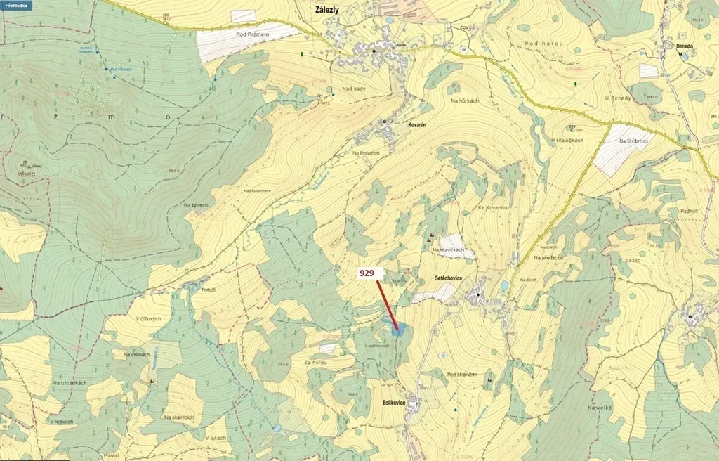 Lesní pozemek o výměře 5 736 m2, parcelní číslo 929, podíl 1/1, katastrální území Setěchovice, obec Zálezly, obec s rozšířenou působností Vimperk, okres Prachatice, Jihočeský kraj.