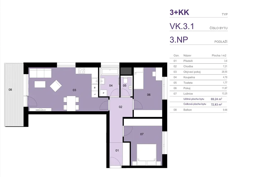 Pronájem částečně zařízeného bytu s dispozicí 3+kk v lokalitě Praha 12 - Kamýk. Byt leží ve třetím nadzemním podlaží novostavby bytového domu v klidné předměstské lokalitě obklopené zelení nedaleko Modřanské rokle, s dobrou dostupností centra metropole. Interiér tvoří prostorný obývací pokoj s kuchyňským koutem a přístupem na balkon, dvě ložnice, koupelna s vanou, samostatná toaleta a vstupní chodba s předsíní. Standardy zahrnují automaticky ovládané žaluzie a systém chytré domácnosti Smarthome. Kromě kuchyně vybavené vestavěnými spotřebiči, koupelny a toalety se byt nabízí nezařízený. Bytový dům byl dokončen v letošním roce, disponuje energetickým štítkem třídy B. Součástí nájmu je sklepní prostor. Garážové parkovací stání je k dispozici za příplatek 3 000 Kč/měsíc. Lokalita předměstí hlavního města sebou nese výhody jak poklidné rodinné atmosféry, tak výborné dostupnosti centra. Jen pár kroků od domu se nachází dvě zastávky autobusů a tramvají Libuš a Sídliště Libuš s množstvím linek do všech částí Prahy. Okolí nabízí veškerou občanskou vybavenost, obchody včetně supermarketu Albert, lékařské ordinace, mateřské, základní a střední školy včetně prestižní Prague British International School, úřady, restaurace, bary, kavárny a vietnamskou tržnici SAPA. V bezprostředním okolí se navíc nachází řada lesoparků, jako třeba Modřanská rokle, Kamýk či keltské oppidum s rozhlednou Závist a cyklostezka vedoucí podél Vltavy až do centra města. K dispozici od února 2026. Měsíční poplatky za služby, vodu a plyn činí 6 500 Kč, elektřina se propisuje na nájemce. Provize RK je ve výši jednoho a deposit ve výši dvou měsíčních nájmů.