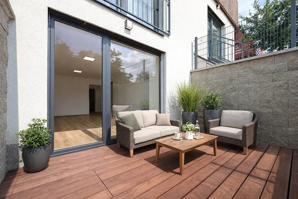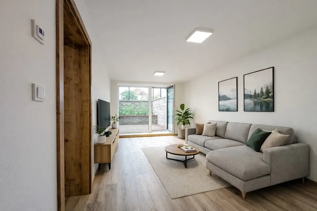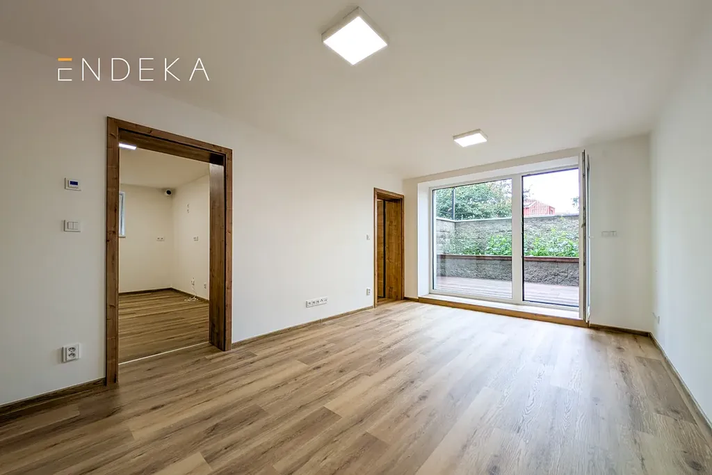 Interiér prošel rekonstrukcí, místnosti jsou prakticky uspořádané a situované na jihovýchod, což zajišťuje příjemné denní světlo. Velké francouzské okno s výstupem na terasu obloženou dřevem nabízí ideální místo pro ranní kávu i večerní posezení. Při rekonstrukci byly použity kvalitní a prvotřídní materiály - vinylová podlaha, kvalitní interiérové dveře s obložkovými zárubněmi a bezpečnostní protipožární vstupní dveře do bytu značky Gerbrich, okna značky Schüco.