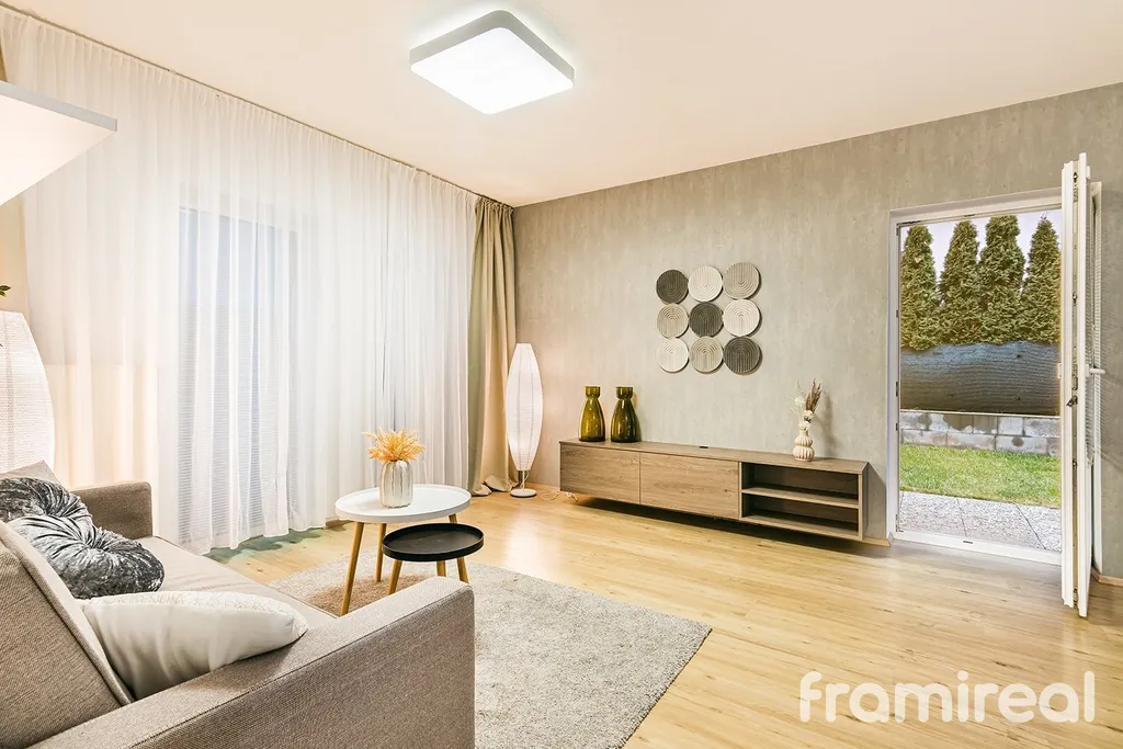 prostorný obývací pokoj s kuchyňským koutem a přímým vstupem na zahradu