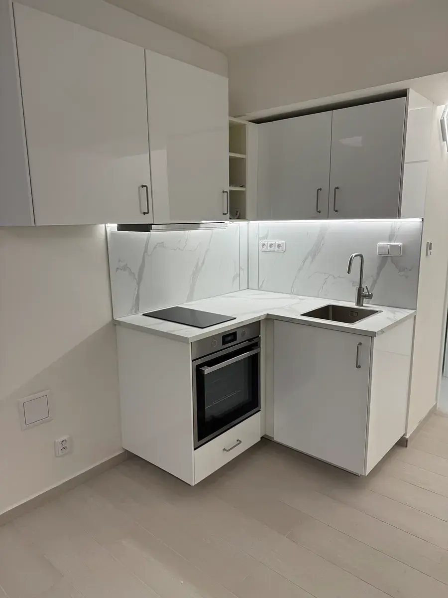 Studio se nachází v suterénu klidného činžovního domu. Sestává z chodby 2m2, kuchyně/kuchyně 15 m2, koupelny/WC 3 m2. Je nově zrekonstruováno, bez vlhkosti (byla provedena hydroizolace domu). Ve studiu jsou plastová okna s izolačními trojskly, studio je vytápěné centrálním topením s kotlem a v celém prostoru je podlahové topení. Kuchyň je vybavena sklokeramickou varnou deskou, troubou s majitelem je možné domluvit lednici a pračku. V průběhu léta není třeba klimatizace a teplo v zimě zajišťuje podlahové vytápění.
