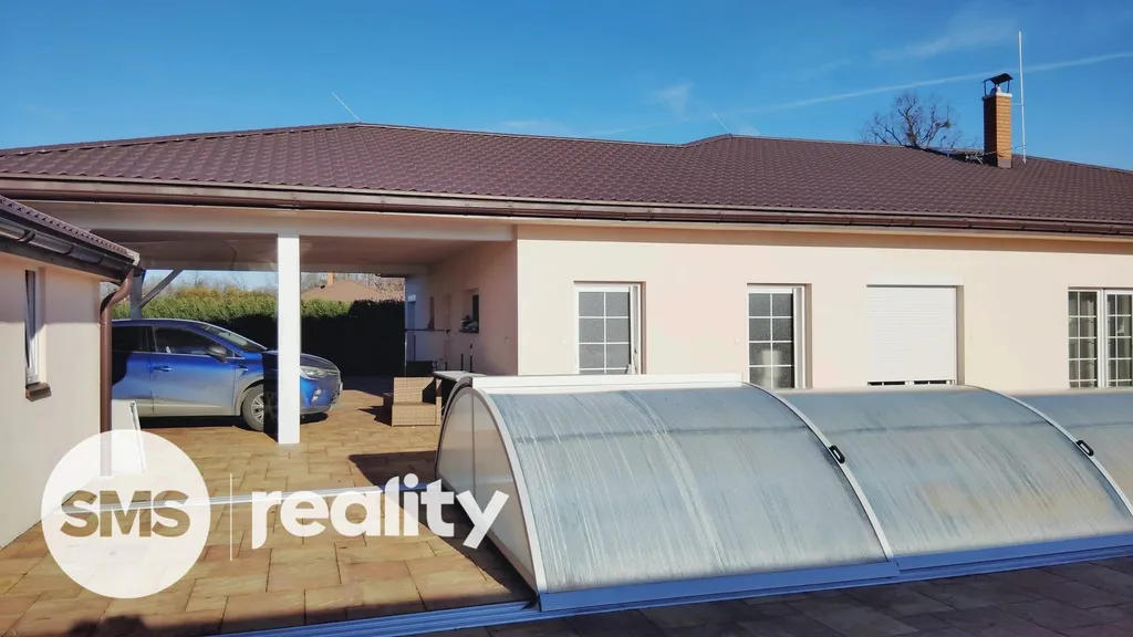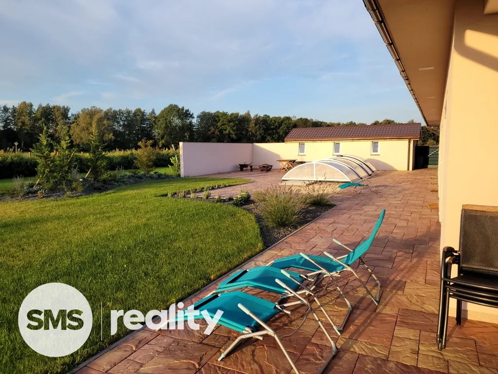 K domu náleží také krásná velká zastřešená terasa o ploše 83 m² , ideální pro relaxaci nebo rodinné oslavy, a vyhřívaný krytý bazén, který ocení nejen děti, ale i dospělí. Na pozemku se nachází zahradní domek o velikosti 24 m², který je celkově podsklepený, a také zahrada s výběhem pro psy a kotcem.