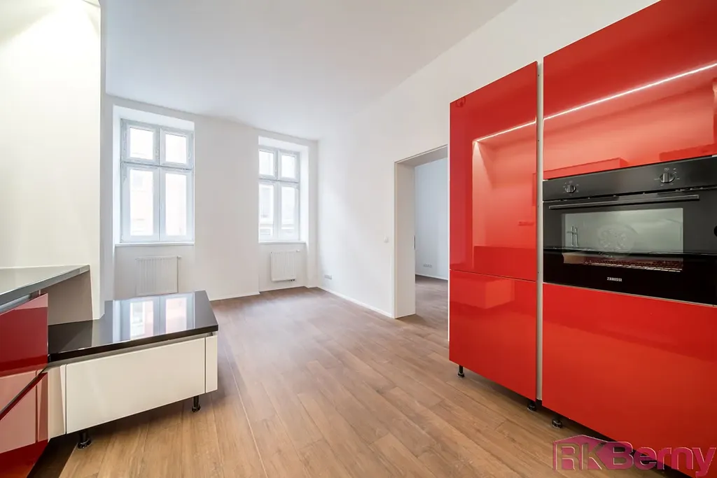 Je rozdělen na pokoj s nadstandardní kuchyňskou linkou vybavenou všemi spotřebičemi – lednicí s mrazničkou, indukční deskou s digestoří, myčkou, mikrovlnou a elektrickou troubou, pračkou i sušičkou.