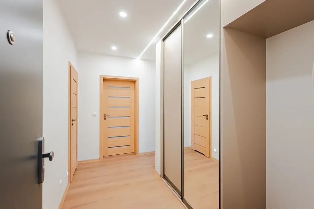 Byt je zrekonstruován kompletně - nové podlahy, dveře i žaluzie v oknech.