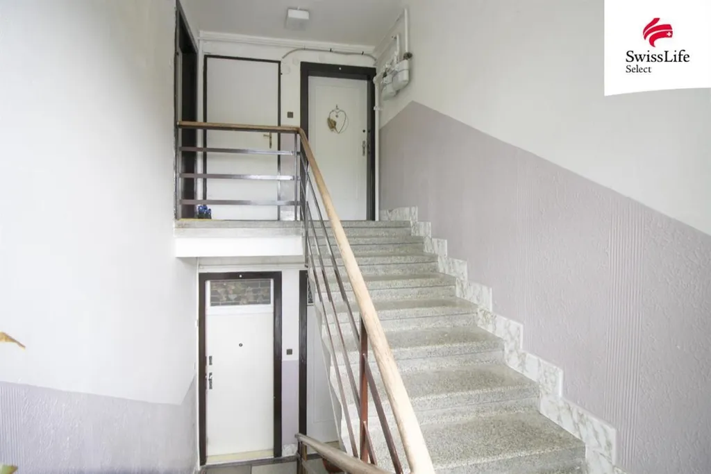 Byt se nachází ve 4.NP a má pouze jeden sousední byt. Vaše soukromí tak nijak neutrpí, i když se nacházíme v podstatě v centru krajského města - na druhou stranu se jedná o klidnou jednosměrnou ulici s velkým parkovištěm hned vedle domu.