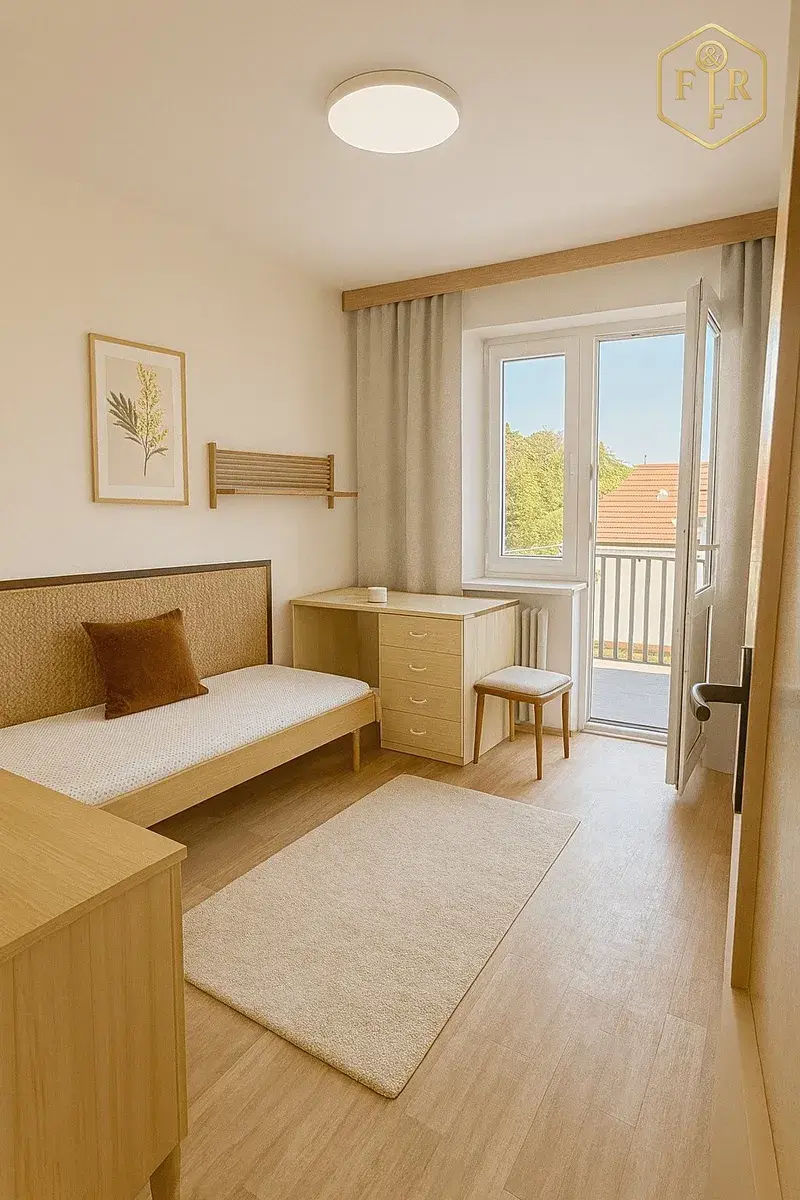 Dispozice 4+1 zahrnuje v přízemí chodbu, kuchyni, obývací pokoj, ložnici, koupelnu a WC, v podkroví pak dva pokoje, komoru a terasu s výhledem do dvora a možnost vybudování ještě jednoho pokoje směrem orientovaný směrem na Západ. K dispozici je také sklep a menší dvorní sklad. Je orientován na Východ a Západ.