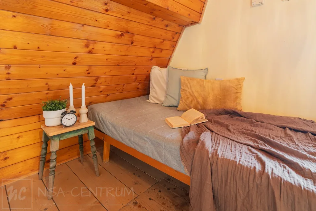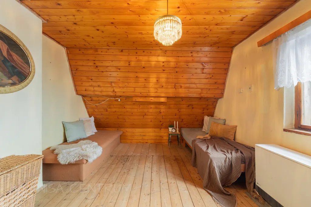 Na pozemku o velikosti 1209 m² se nachází vzrostlé stromy a druhá, menší chatka. Jedná se proto o perfektní možnost investice, když první chatu můžete předělat na bydlení a druhou pronajímat za účelem krátkodobého pronájmu.