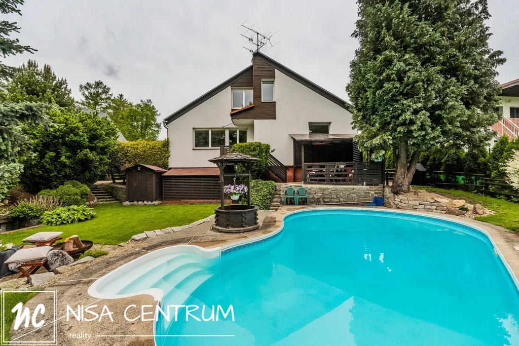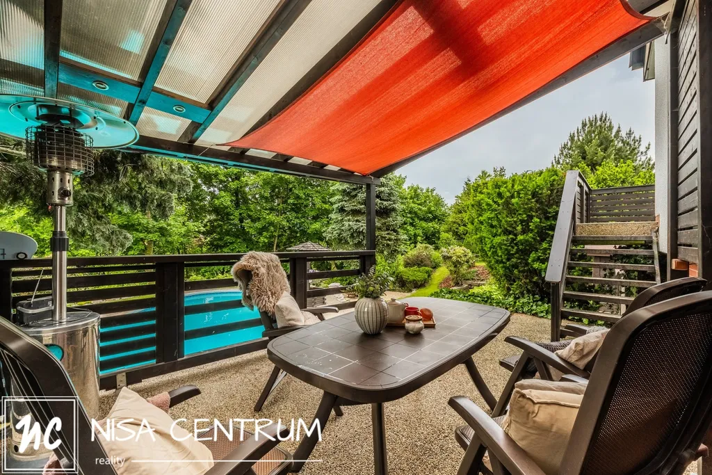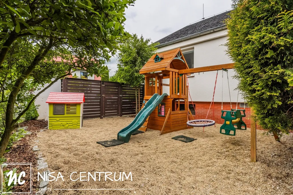 Za domem se nachází naprostá oáza klidu s nádherným atypickým bazénem, dostatečně velkou pergolou pro posezení v letních měsících, dětské hřiště a menší sklípek. Zahradu navrhoval profesionální zahradník.