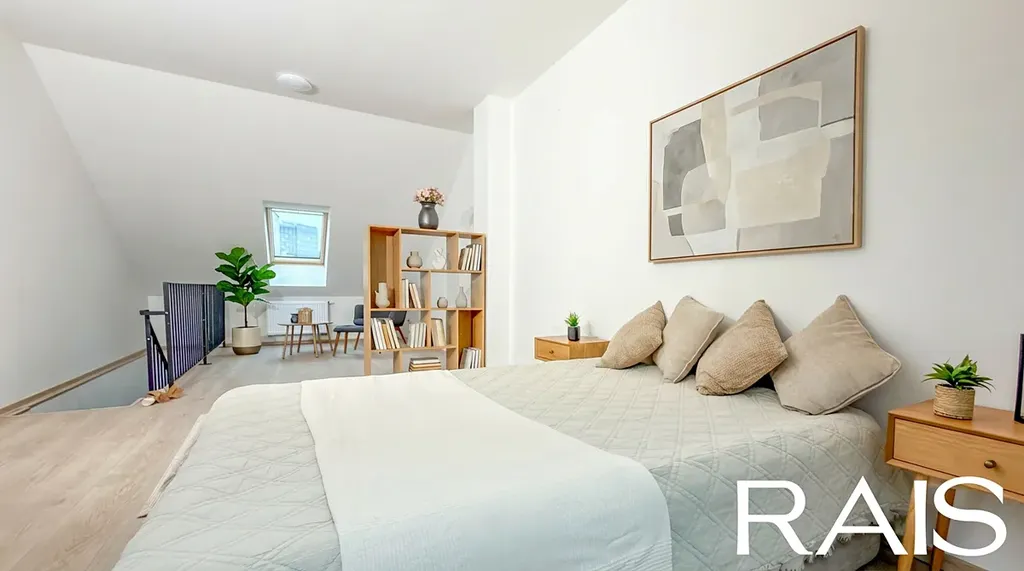 Interiér bytu je světlý a vzdušný, s velkým potenciálem k dotvoření podle vlastních představ. Spodní patro nabízí prostorný obývací pokoj, přípravu na kuchyňskou linku a koupelnu se sprchovým koutem a toaletou. Horní podlaží tvoří velkorysý otevřený prostor, ideální jako ložnice s pracovnou. Sanitární vybavení je značky Grohe. Vytápění i ohřev vody jsou řešeny centrální plynovou kotelnou v domě.
