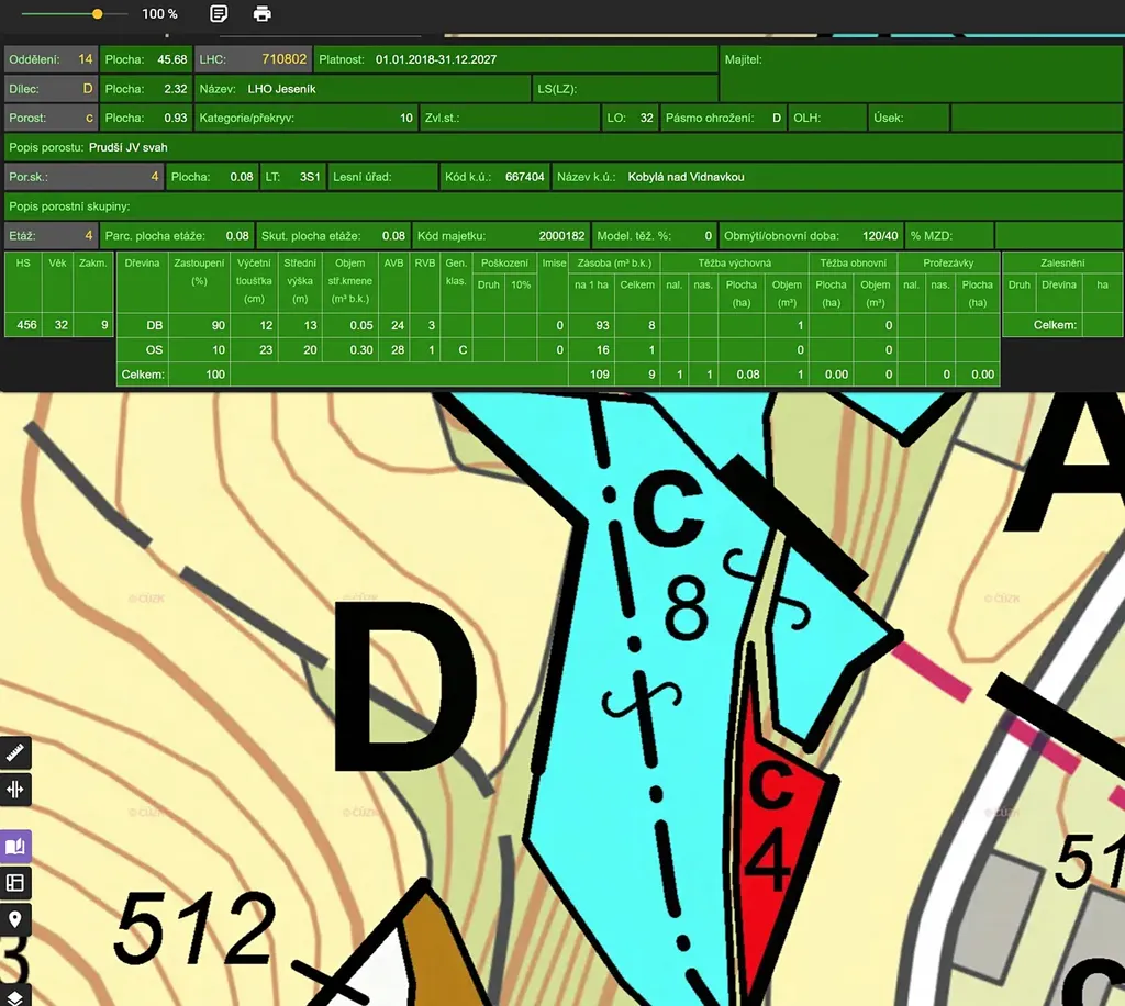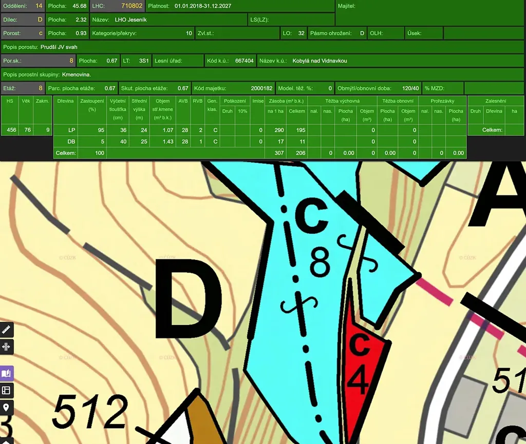 Porost c8: věk 81 let, 95% lípa, 5% dub, zásoba v roce 2018 206m3