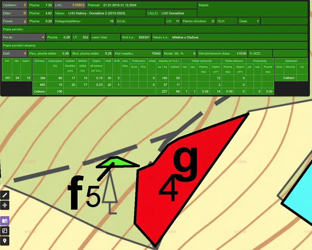 Porost (viz obrázek): Věk 43 let, smrk 85%, modřín 15%, zásoba před 9 lety 66m3.