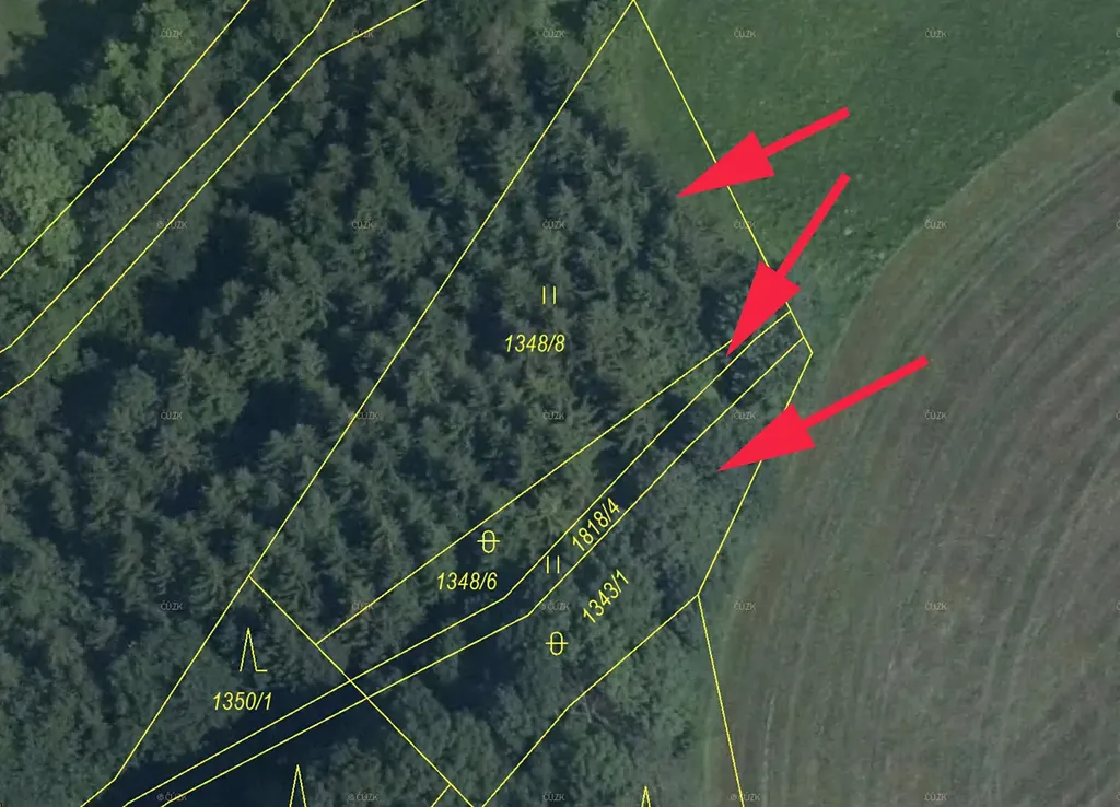 Prodáme pozemek, louku a ostatní plochu s porostem stromů (možno snadněji kácet, než v lese) v k.ú. Horní Studénky, parc.č. 1348/8, 1348/6 a 1343/1.