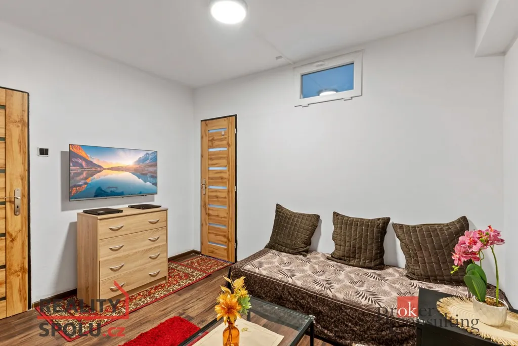 Byt se skládá ze vstupní chodby, ze které je přístup do jednotlivých místností. K dispozici je kuchyň, prostorný obývací pokoj, samostatná ložnice, koupelna a oddělené WC. Interiér je laděn do příjemného, ale moderního, vkusného stylu s důrazem na dřevěné prvky, které bytu dodávají útulnou atmosféru. Prostor působí čistě a udržovaně. Součástí je také sklepní kóje o velikosti 5m2.