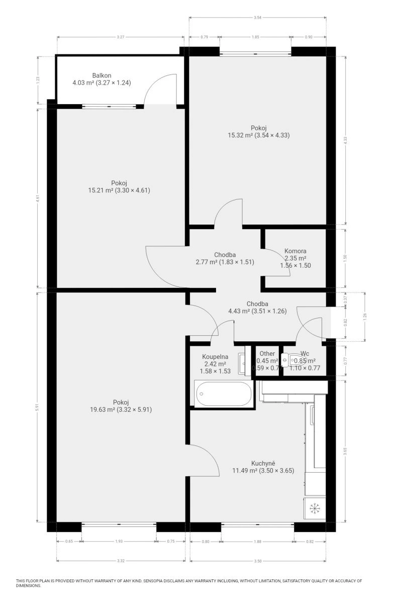 Dispozice bytu je velmi praktická – nabízí tři samostatné, neprůchozí pokoje, kuchyni, koupelnu, samostatné WC a vstupní chodbu. Díky uspořádání je byt vhodný jak pro rodinu, tak i ke spolubydlení. Byt se nabízí vybavený dle fotografií. Kuchyně je vybavena lednicí, myčkou, troubou, deskou na vaření a digestoří.