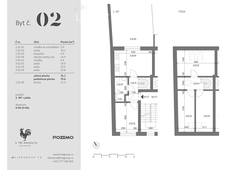 Projekt U tří kohoutů nabízí stylový byt č. 2 - 5+kk o ploše 79,6 m². Nachází se v centru Ivančic u Brna a nabízí moderní bydlení v příjemném prostředí. Největším benefitem je prostorný obytný prostor s kuchyňským koutem a přímým vstupem na sever orientovanou terasu o velikosti 31,3 m², která poskytuje ideální místo k relaxaci.