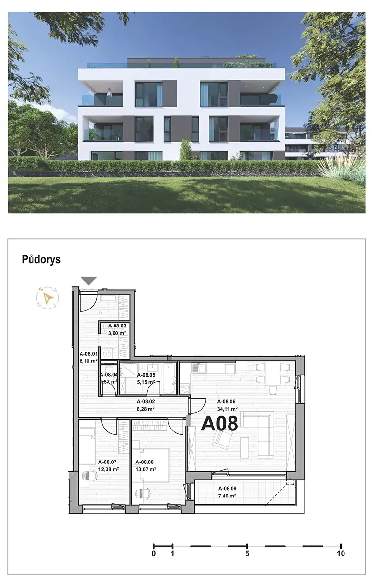 Do této kategorie patří i prezentovaný byt s označením BD4_A08 o dispozici 3+kk s celkovou plochou 98,47 m² (byt 83,46 m², balkon 7,46 m² a sklep 7,55 m²).