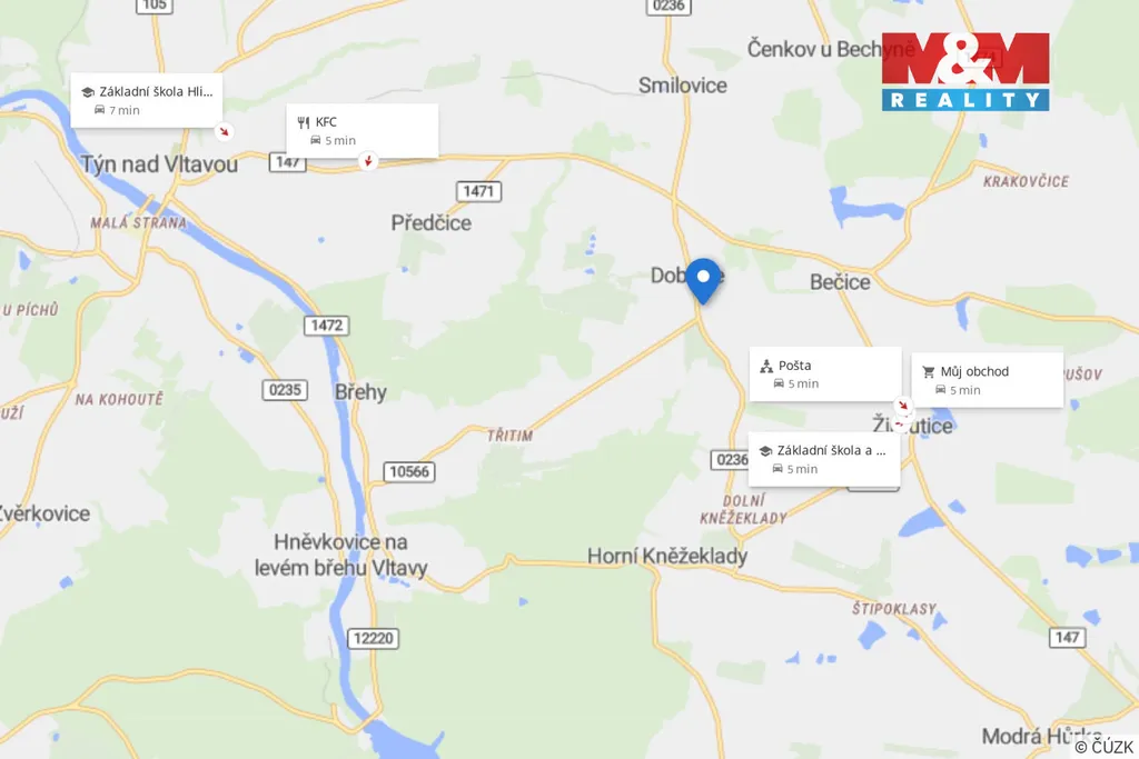 Nabízíme k prodeji pozemek k bydlení o rozloze 870 m² v malebné obci Dobšice u Týna nad Vltavou. Tento pozemek se nachází na klidném okraji obce a představuje ideální místo pro výstavbu vašeho vysněného domova. Veřejný vodovod, kanalizace a elektřina jsou v těsné blízkosti pozemku, což usnadňuje napojení na inženýrské sítě. Stav pozemku umožňuje rychlé zahájení stavebních prací. Lokalita nabízí klidné bydlení v blízkosti přírody, přičemž veškerá občanská vybavenost je snadno dostupná v nedalekém Týně nad Vltavou, JTE Temelín 10 km, České Budějovice a Písek 30 km. Nechte se okouzlit tímto atraktivním místem pro váš nový domov.