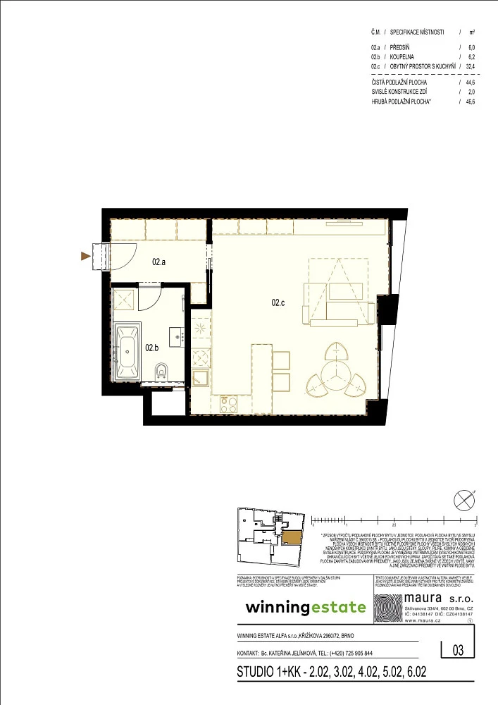 Jednotka 6.02 má 46,6 m², nachází se v 6. nadzemním podlaží. K jednotce náleží i sklepní kóje nacházející se v podzemním podlaží. Na základním vybavení jsme si dali skutečně záležet.