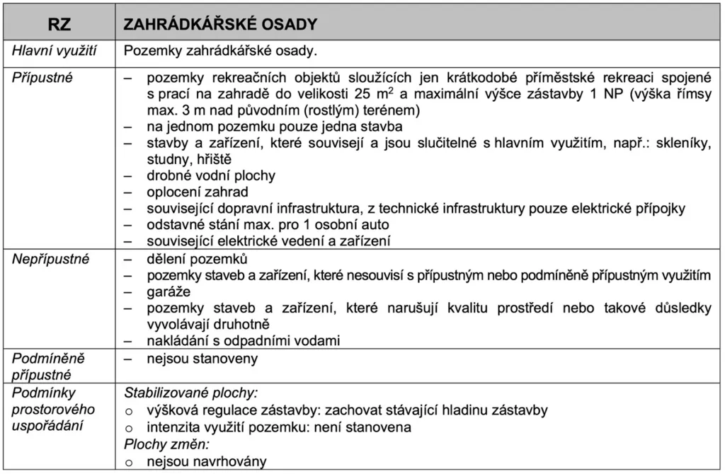 Dle platného územního plánu spadá do plochy RZ - zahrádkářské osady (viz. fotogalerie).