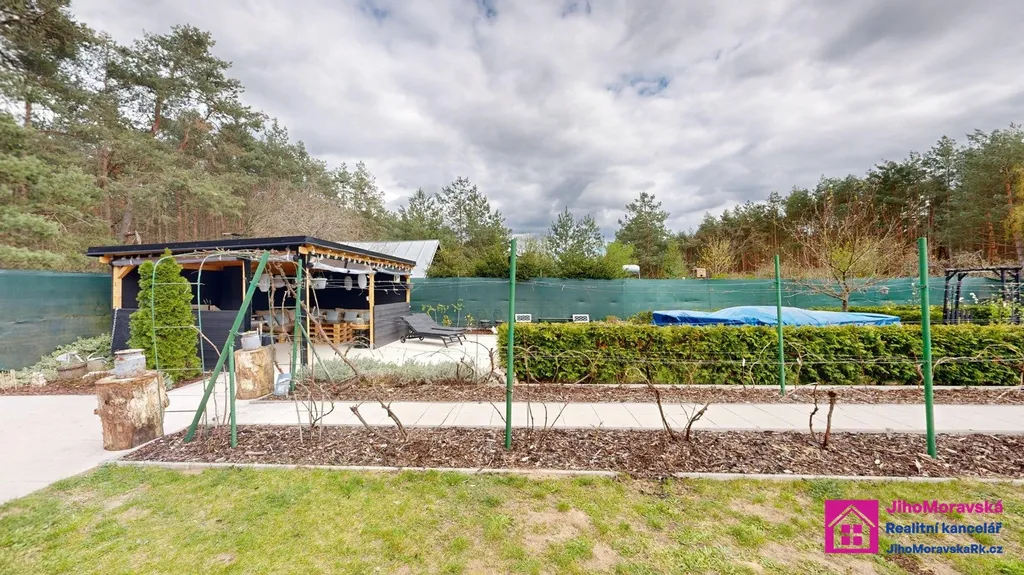Součástí prodejní ceny je následující vybavení: Pergola s krbem a zástěnami s paletovým posezením, matracemi, stolem z palet a skla. Dvě venkovní boudy. V první je úschovna na kola plus malý sklep a ve druhé keramické wc, kamenné umyvadlo a sprchový kout na solární sprchu. Zelená maringotka pro úschovu nářadí atd. 5x vyvýšené záhony, nadzemní bazén s příslušenstvím, trampolína, dětský domeček s terasou. Velká terasa s levandulemi, stůl a paletové posezení s matrací a šicím strojem na boty jako stoleček. Veškeré solární osvětlení zahrady a dva bečáry na dešťovou vodu.