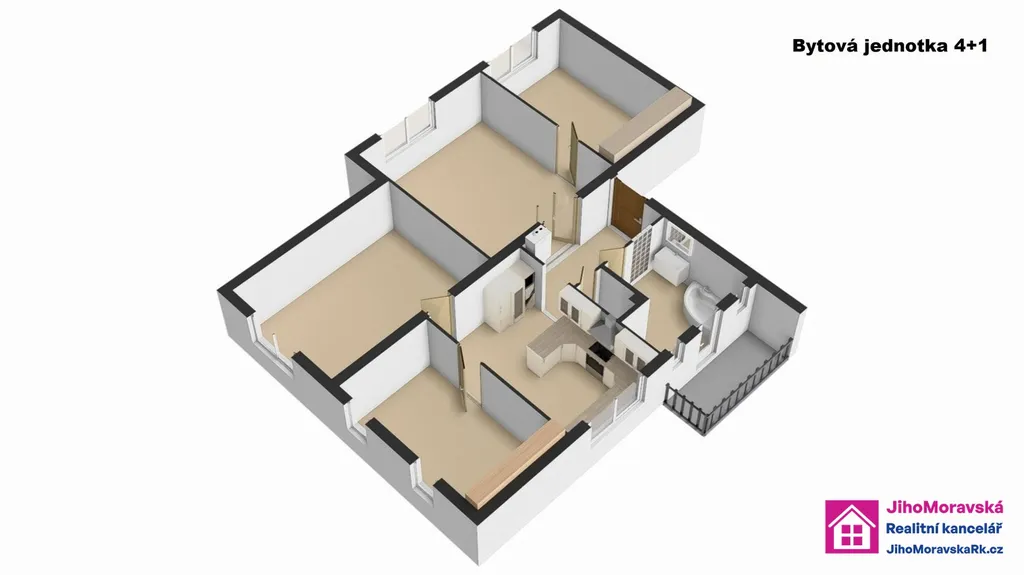 Dispozice: předsíň, koupelna (rohová vana), balkón, toaleta, kuchyně a 4 pokoje. Půdorys bytu naleznete ve fotogalerii.V suterénu bytového domu se nachází zděný uzamykatelný sklep s plochou 11 m² a také společná nebytová jednotka. Každý vlastník bytu vlastní také podíl na této nebytové jednotce.