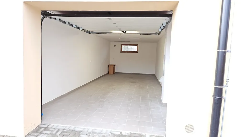 Společně s bytem je možné pronajmout i garáž pro 2 automobily o ploše 37,5 m2, která se nachází v přízemí domu. Do garáže s el. vraty je přivedena voda a elektřina. Pronájem garáže 4000,- Kč/měsíc.