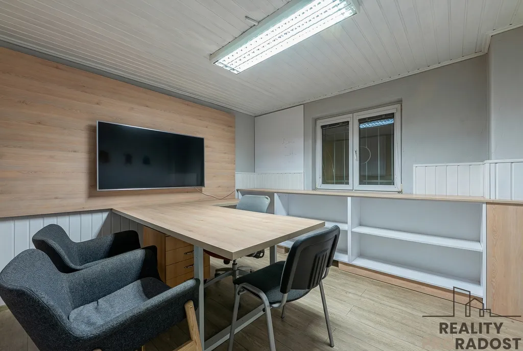 Vedlejší budova slouží jako kompletní technické a sociální zázemí s kotelnou, WC, sprchami, šatnami a provozními prostory o ploše cca 294 m².