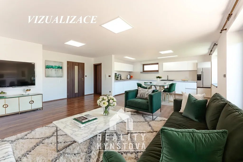 Na prostorný obývací pokoj navazuje kuchyňský a jídelní kout. A nechybí ani komora. Z obývacího pokoje vstoupíte rovnou na terasu o výměře 25 m2 s pěkným výhledem do zahrady.
