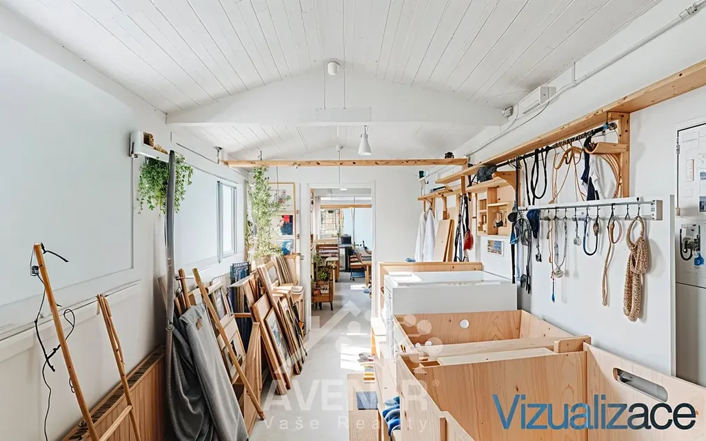 Přízemí: vstupní prostory se skladovými prostory a vstupem do sklepních prostorů, vstup do vyvýšeného přízemí, kde naleznete kancelář, toaletu, dílnu a vstup do podkroví domu.