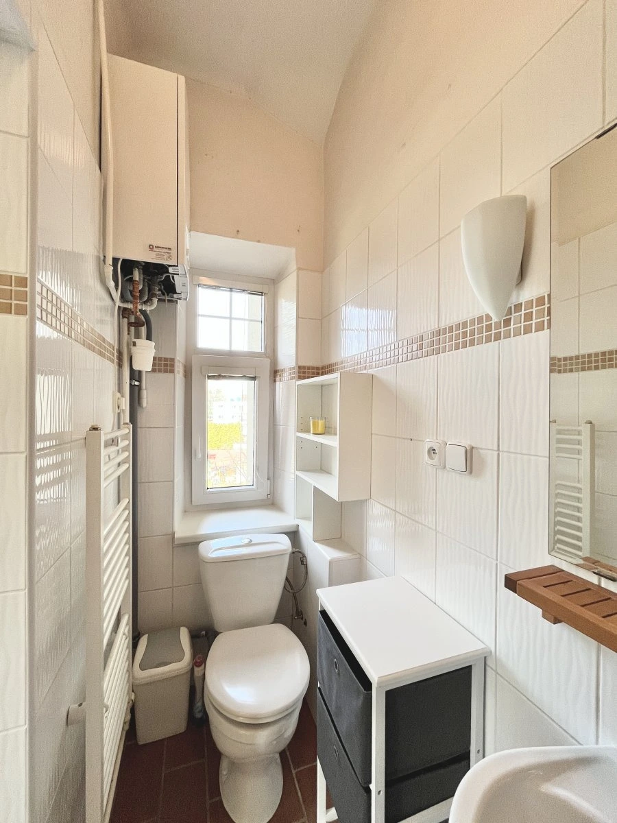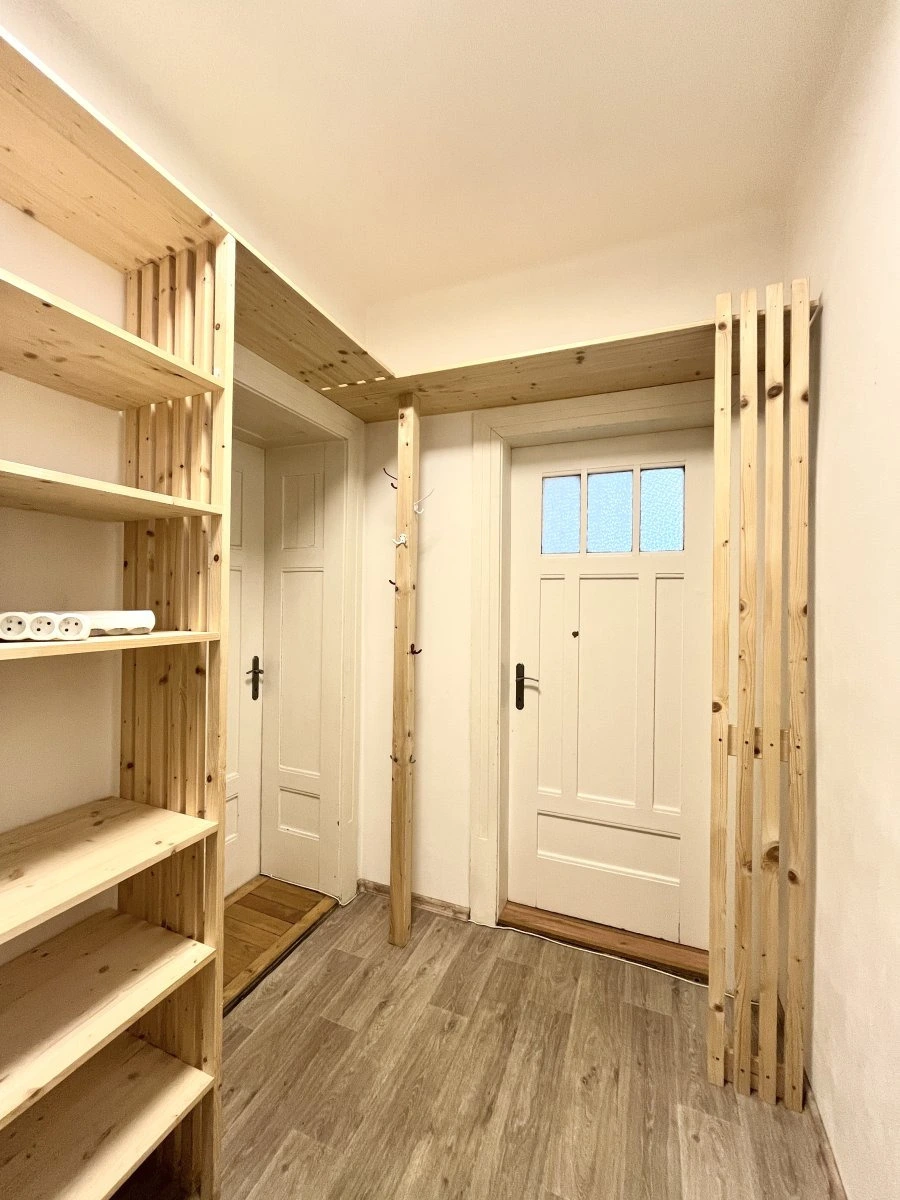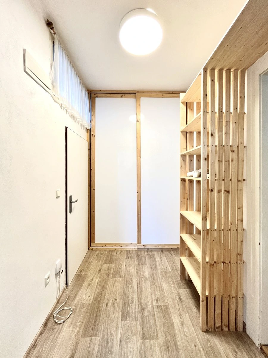 Byt se nabízí částečně vybavený. Kuchyně disponuje lednicí, elektrickým sporákem, mikrovlnnou troubou a digestoří. V obývací části je spací patro, vestavěné police a pračka. V druhém pokoji se nachází velká vestavěná skříň. V koupelně je sprchový kout, umyvadlo, toaleta a topný žebřík.