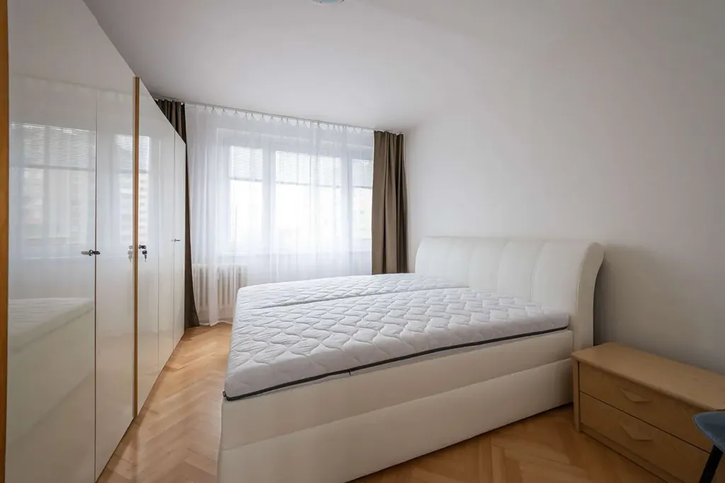 Kuchyň je zcela nová s varnou deskou, elektrickou troubou, digestoří a lednicí, jídelní stůl + 4x židle. V koupelně je sprchový kout a pračka, WC samostatně. V předsíni úložné prostory na oblečení i botník. V ložnici nová manželská postel, noční stolky a šatní skříně. Plně vybavený obývací pokoj nábytkem se vstupem na balkon. Vše co vidíte na fotkách, v bytě zůstává.