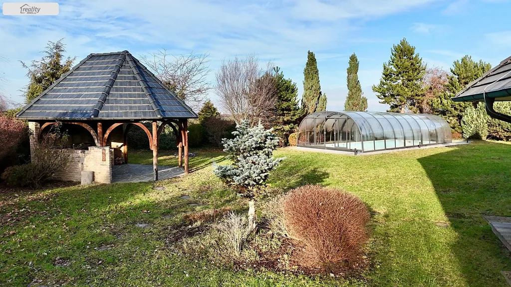 Zahrada, Krytý vyhřívaný bazén se slanou vodou a parkování s dílnou.