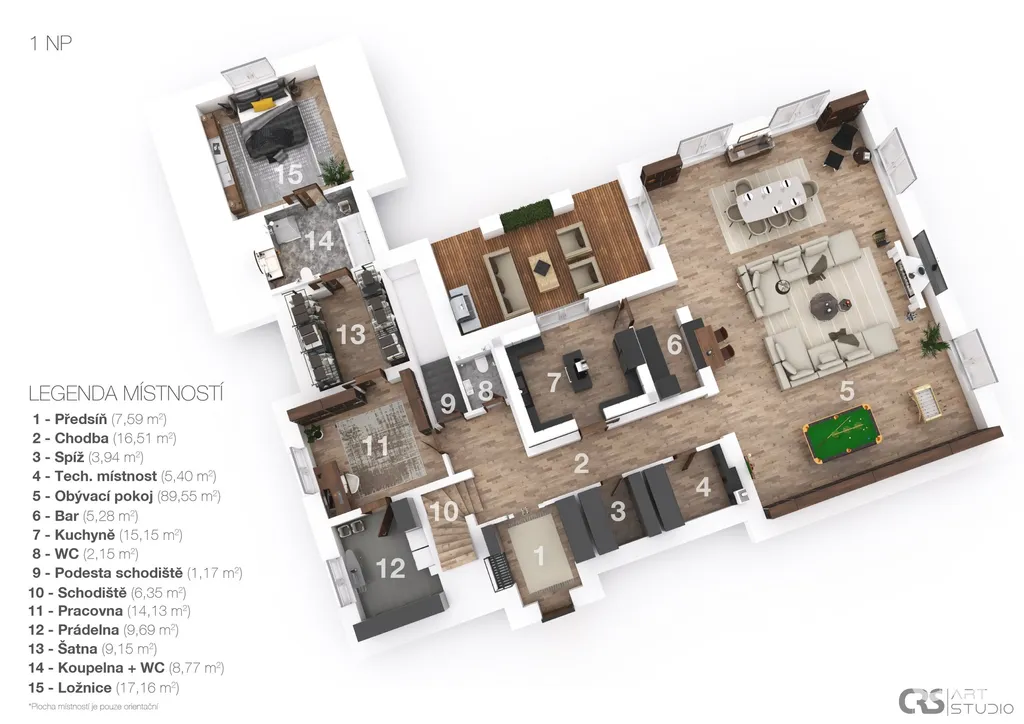 Projektovaný dům o podlahové ploše 292 m² nabízí velkorysé a promyšlené dispoziční řešení: čtyři samostatné ložnice, každá s vlastní koupelnou a toaletou, dvougaráž s přímým vstupem do domu, technické zázemí a množství úložného prostoru. Dominantou domu je 95 m² velký obývací prostor s otevřeným krovem, krbem, jídelnou a barem – srdce celého domu ideální pro rodinné večery i společenská setkání. Z jihozápadně orientované terasy se otevírá působivý výhled na hladinu Lipna a panorama Šumavy.