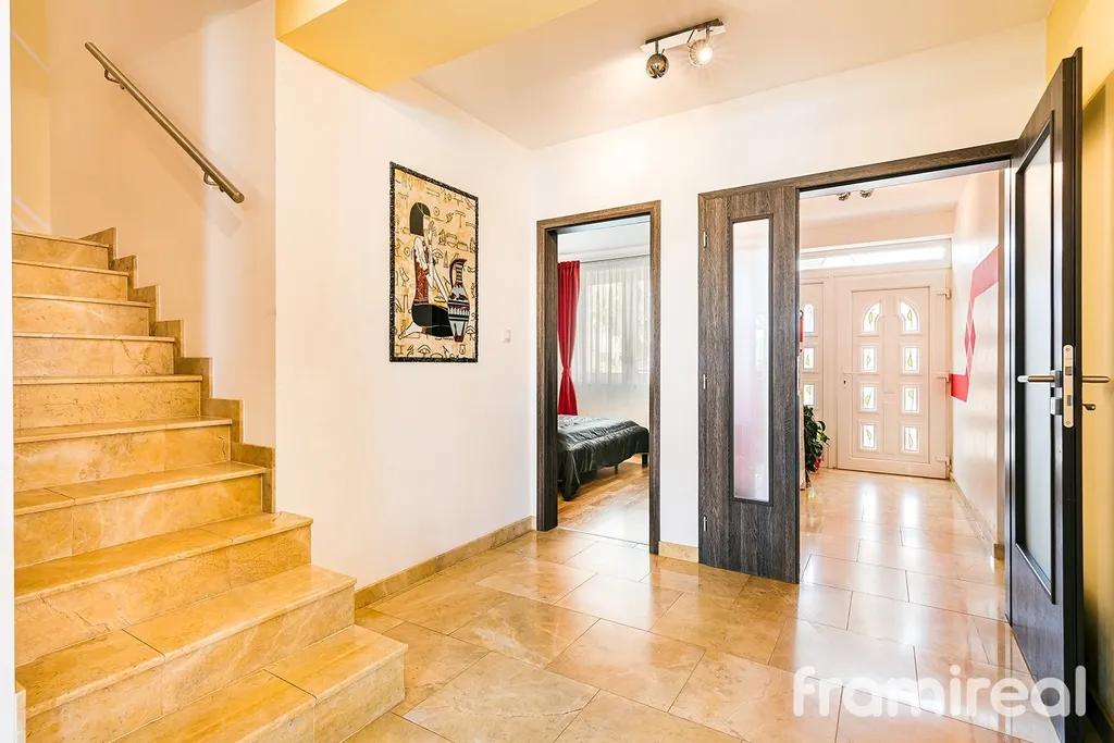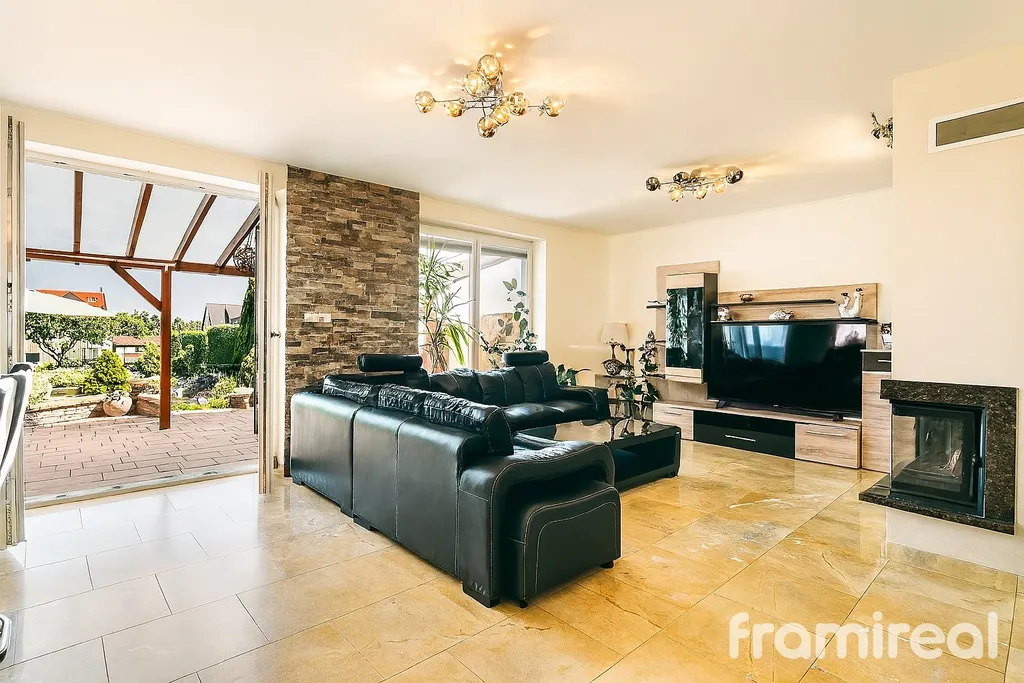 V přízemí se nachází obývací pokoj s krbem a klimatizací, propojený s kuchyňským koutem a jídelnou. Podlahové vytápění v kombinaci s mramorovou dlažbou zajišťuje příjemnou teplotu i v chladnějších dnech.