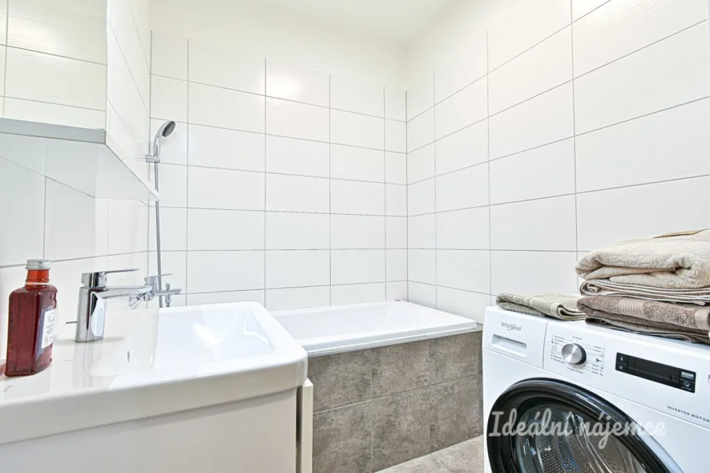 Byt se nabízí kompletně vybavený moderním nábytkem. Kuchyňský kout disponuje varnou deskou, digestoří, troubou, myčkou, novou lednicí, s mrazákem a součástí je i barové sezení. Ložnice je zařízena prostornou šatní skříní a manželskou postelí s kvalitní matrací. Součástí koupelny je vana, umyvadlo a zcela nová pračka. Toaleta je samostatně oddělená.