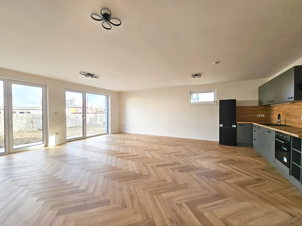 Jednotka disponuje podlahovou plochou 106 m2. V 1 NP se nachází velký obývací pokoj s kuchyňským koutem o výměře 41 m2, vstupní hala, technická místnost, toaleta s umyvadlem a šatna pod schodištěm. Kuchyně s vestavěnými spotřebiči zn. Candy je součástí prodeje. Obývací pokoj je prosvětlen velkými francouzskými okny a v jeho rohu je připravený komín na instalaci krbových kamen. V technické místnosti je umístěn centrální kotel a připravený přívod vody a odpad pro pračku se sušičkou.