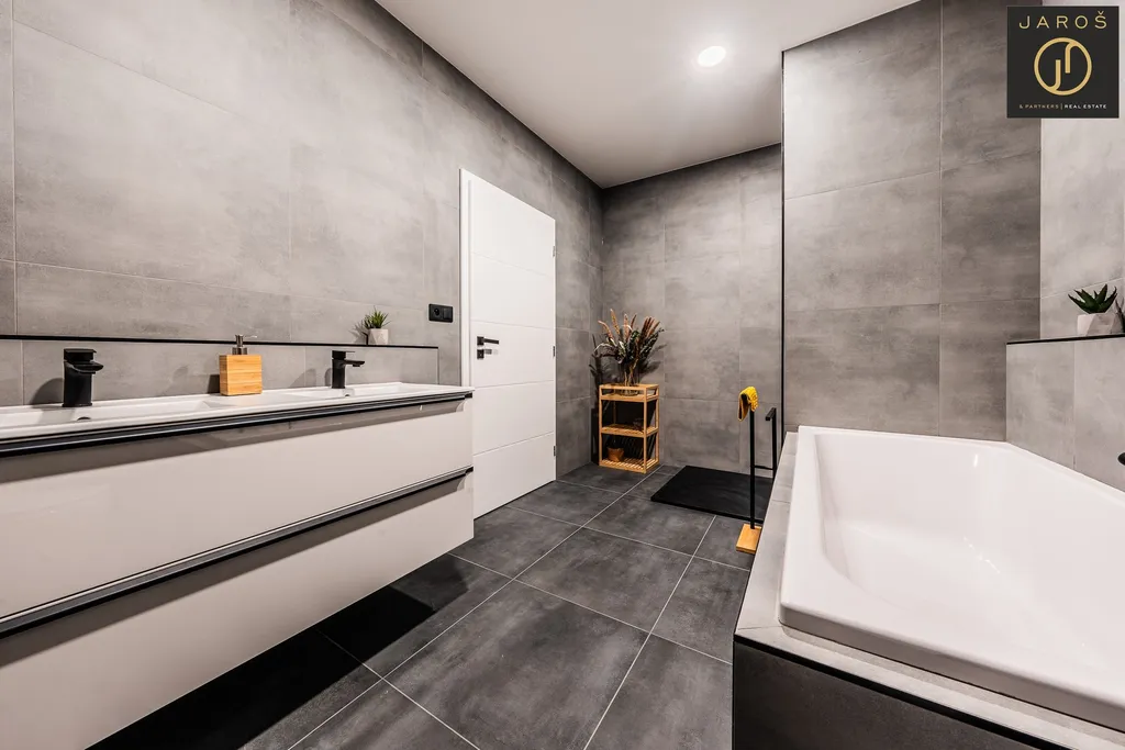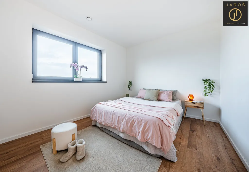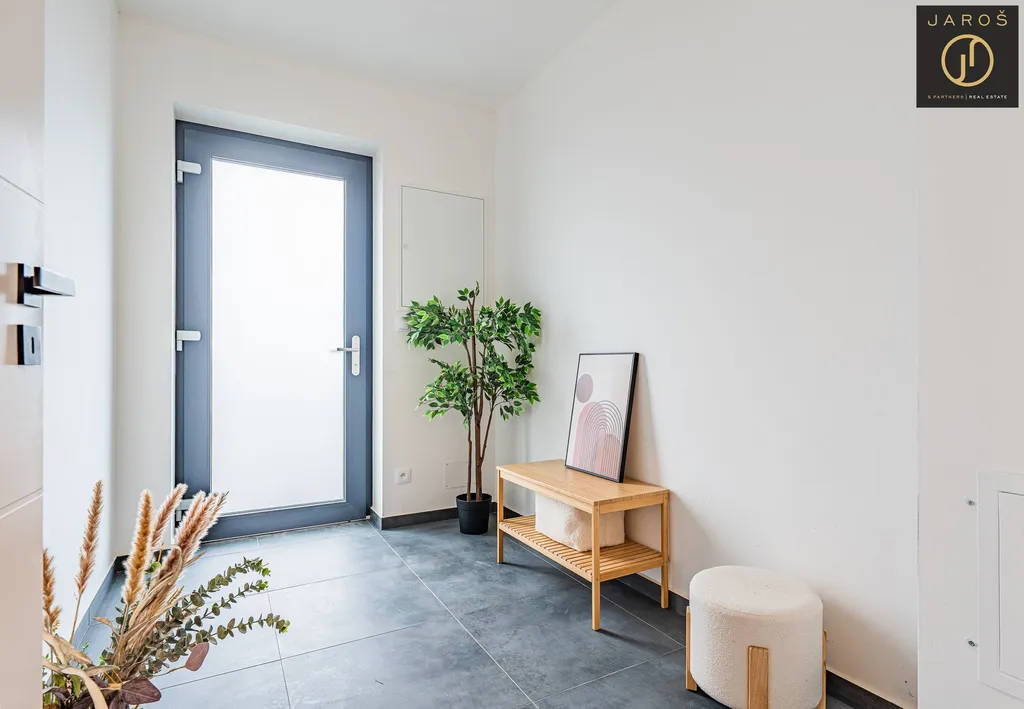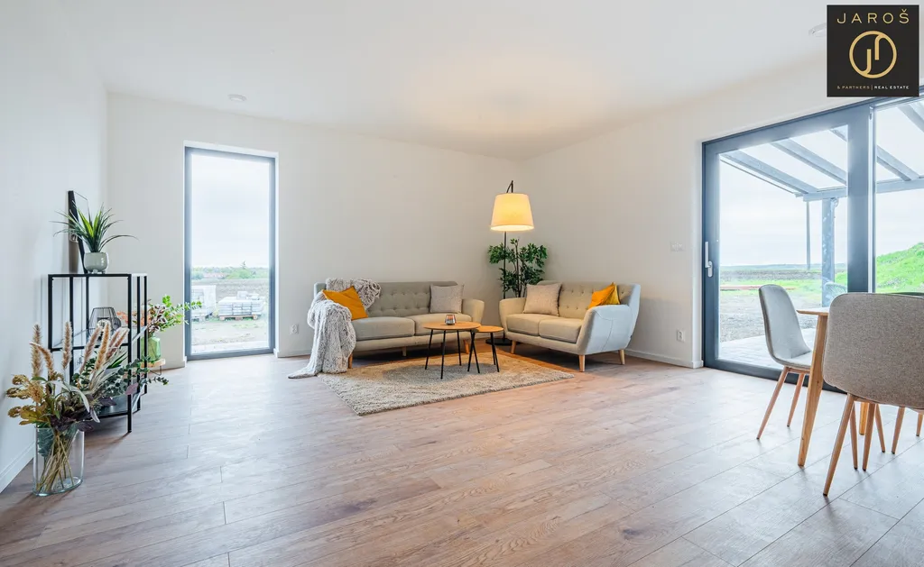 Dům nabízí promyšlenou dispozici a kvalitní zpracování. Interiér tvoří světlý obývací prostor s kuchyní a přímým vstupem na prostornou terasu, tři samostatné pokoje, koupelna s vanou, sprchovým koutem a toaletou, dále samostatné WC. Na podlahách je kombinace plovoucích podlah a dlažby.