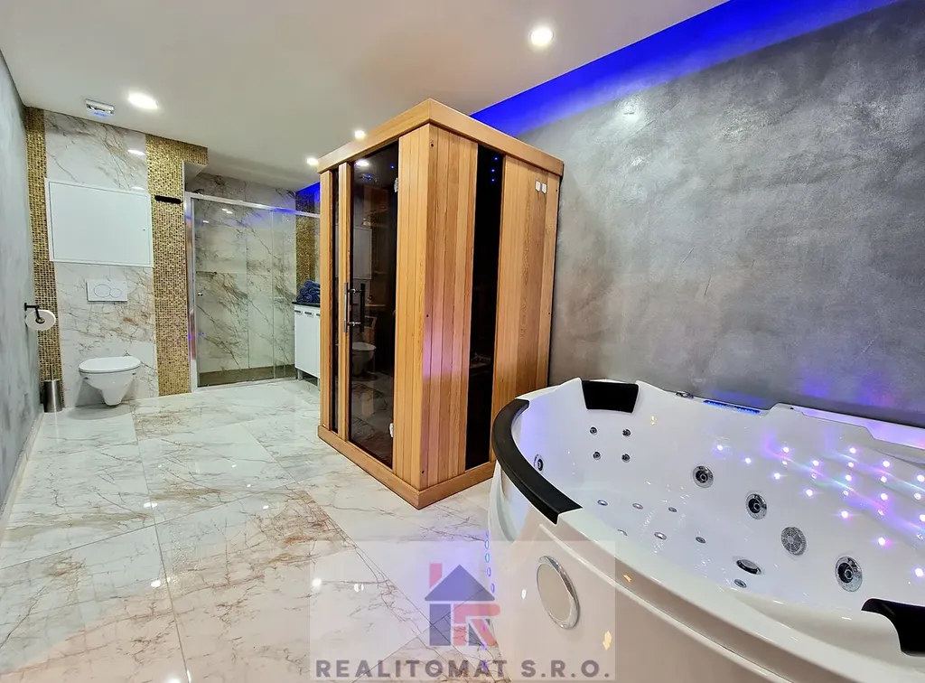 Wellness prostorná koupelna s vířivou hydromasaní vanou pro 2 osoby, led, sauna, sprchový kout.