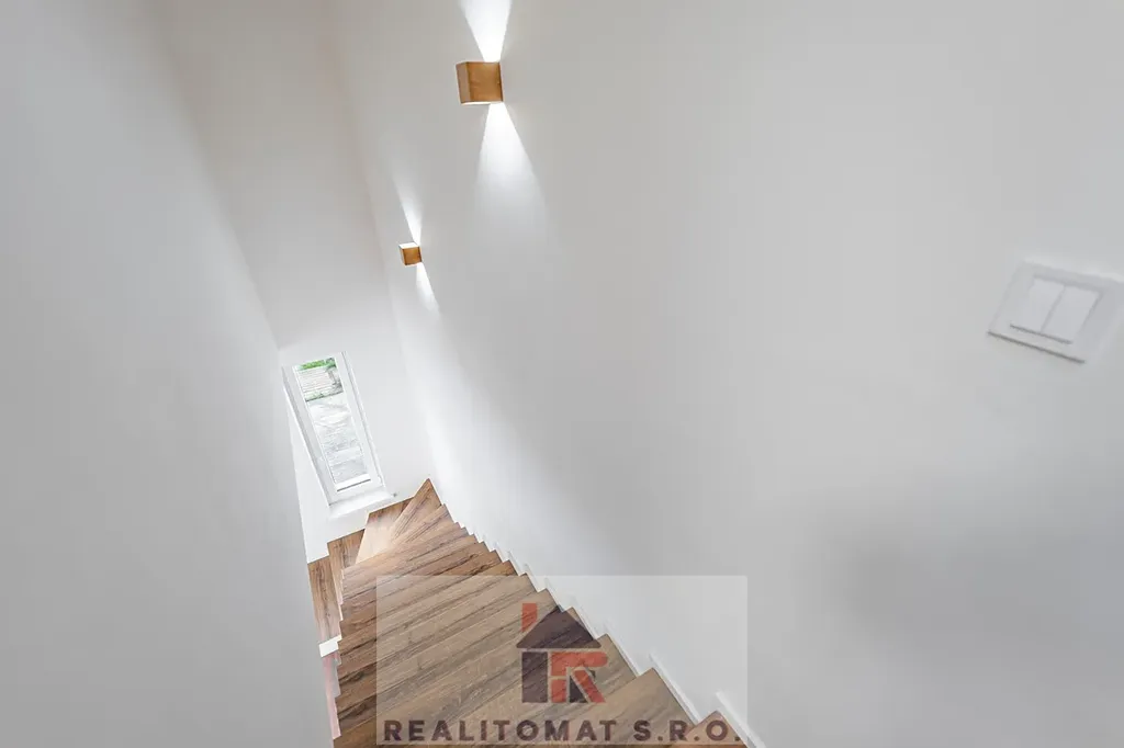 Technická místnost na bojler a praktická vstupní chodba, druhá technická místnost v patře na pračku a sušičku.