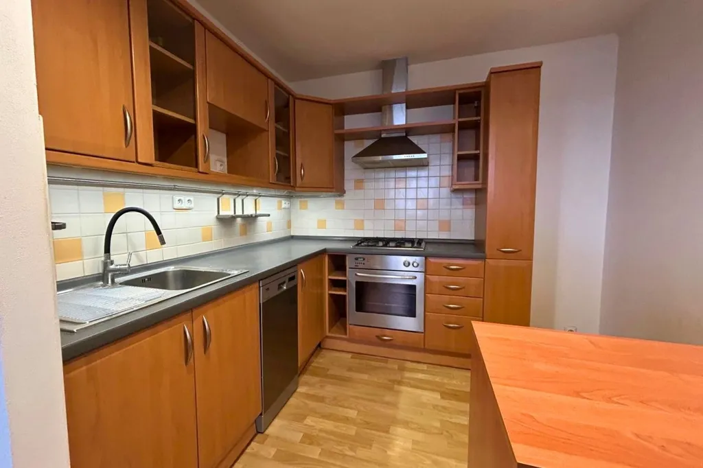Kuchyňská linka je vybavena myčkou, troubou a sporákem, lednice není součástí vybavení. V koupelně je připravený prostor pro pračku se sušičkou. Lodžie je zasklená.