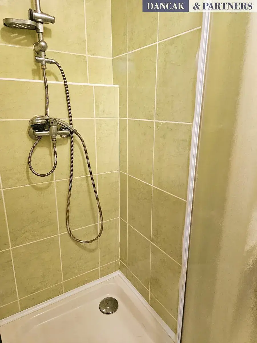 Koupelna je vybavena sprchovým koutem, umyvadlem a toaletou. V předsíni je odkládací stěna s botníkem a k dispozici je také praktická komora.