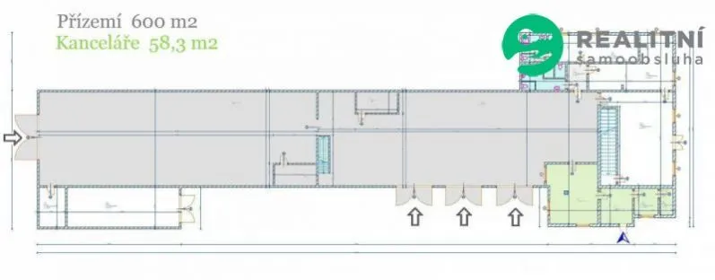 - přízemí v patrové budově 600 m2, cena: 69 Kč/m2/měsíc
